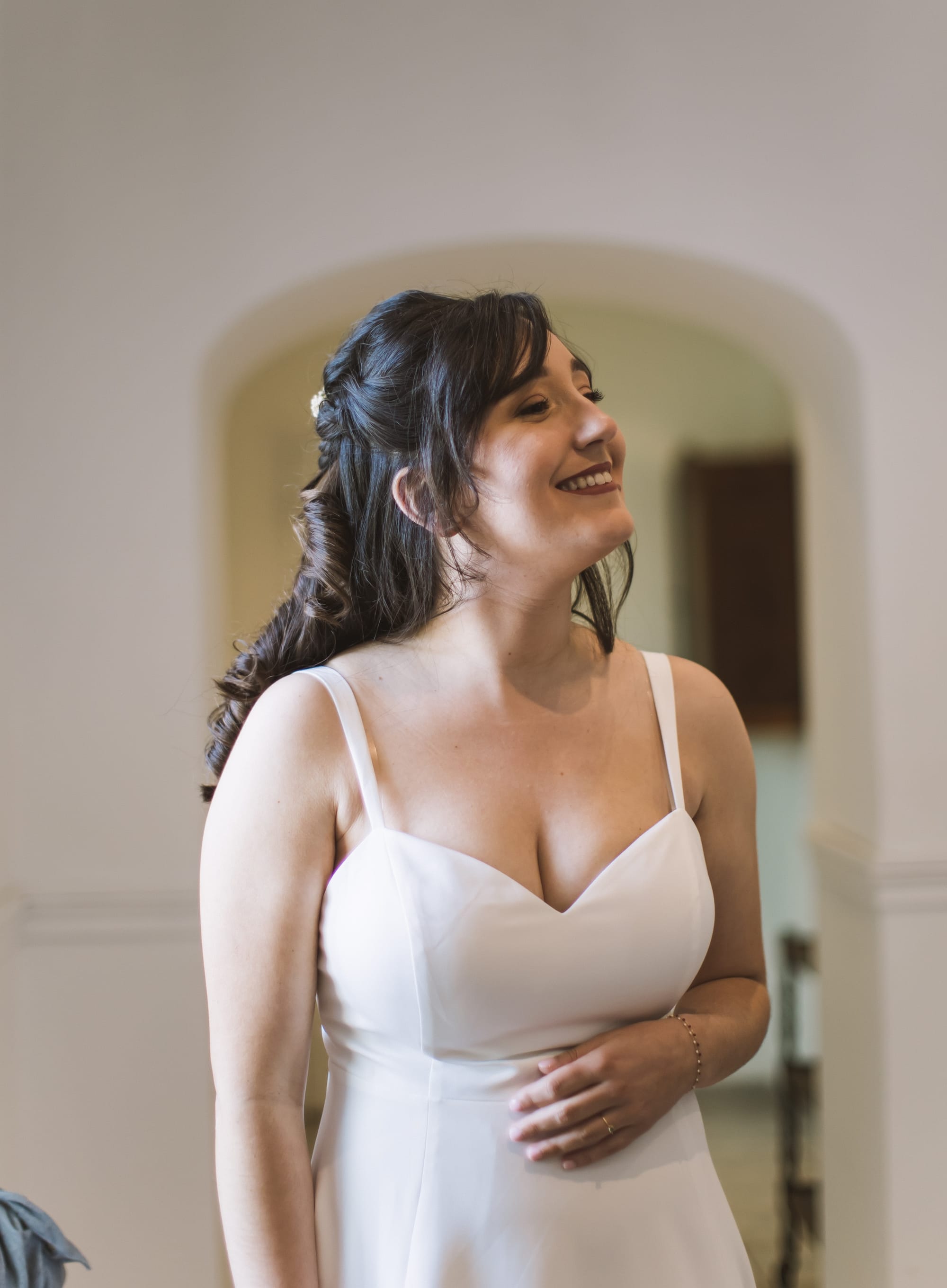 Mariée robe guipure à bretelles, coiffure cheveux longs et bouclés