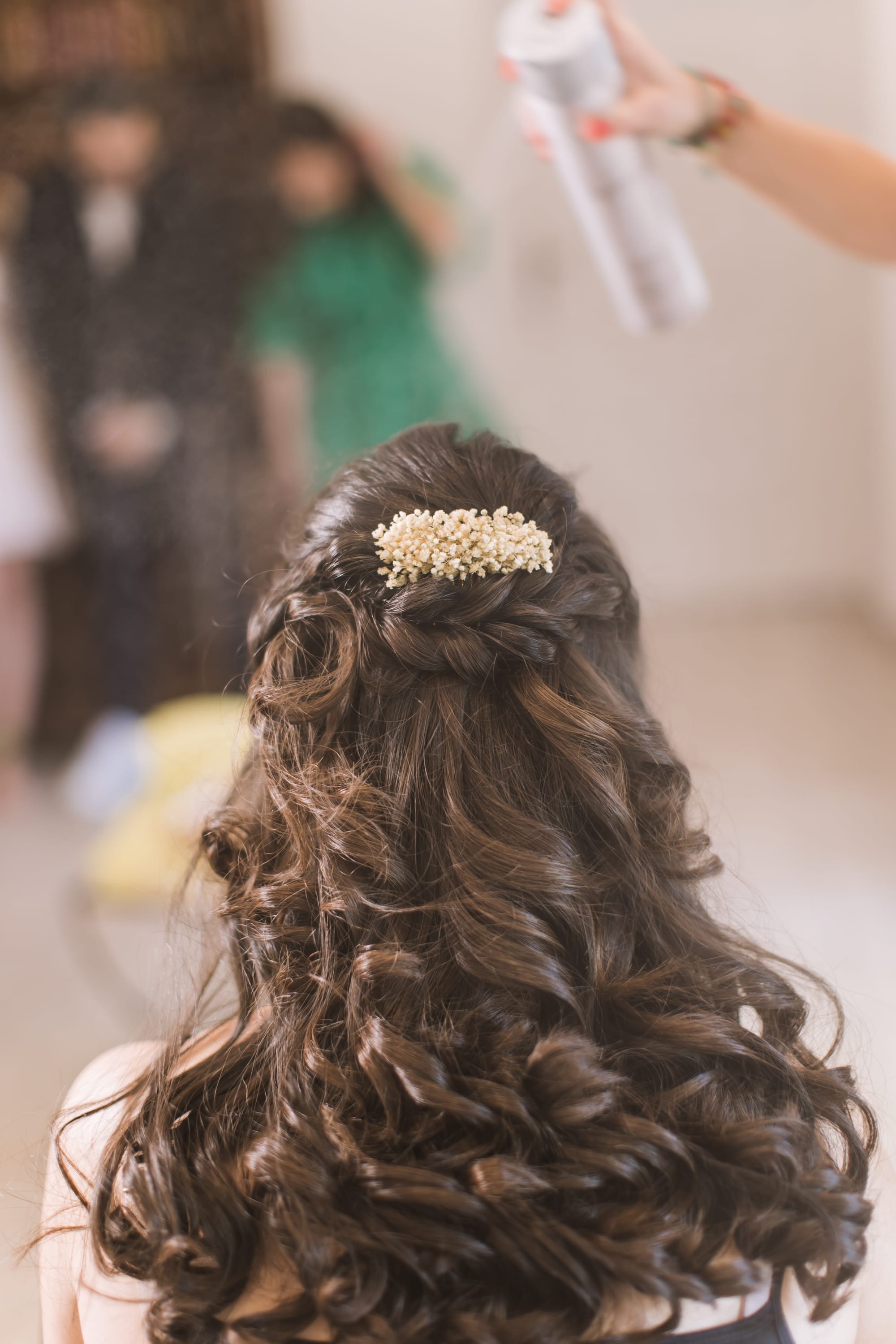 Coiffure de mariage douce et romantique demi chignon avec boucles et barrette avec gypsophile
